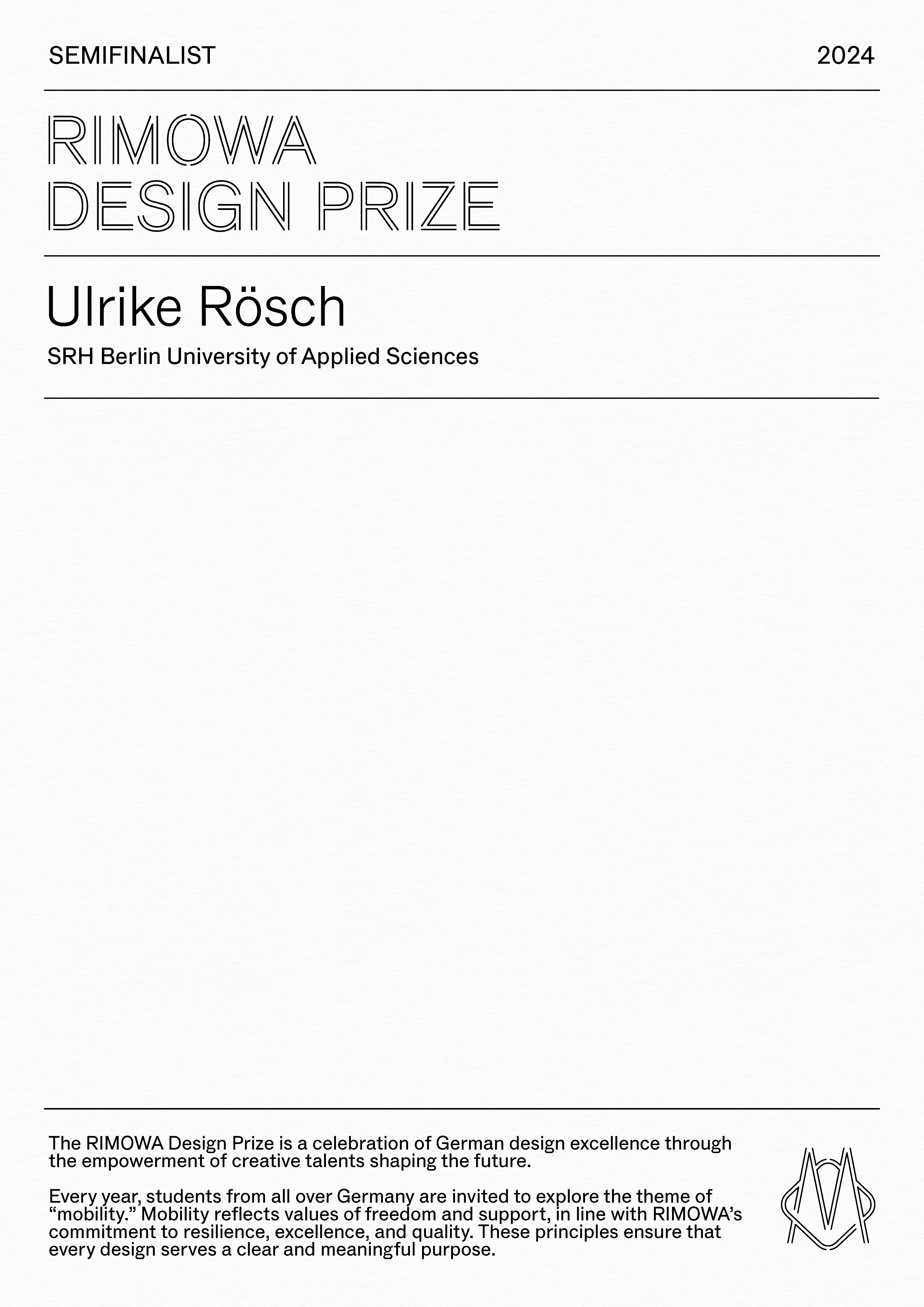 Für den zweiten Rimowa Designpreis stand Mobilität im Mittelpunkt. Gemeinsam mit Levente Janeck entwickelte ich den Regenfänger – einen adaptiven Wasserfilter, der Regenwasser aus Fallrohren auffängt, filtert und im städtischen Raum als Trinkwasser verfügbar macht. Ausgangspunkt war die Frage, wie sich Mobilität weiter fassen lässt: nicht nur als Bewegung von Objekten, sondern auch als Zugang zu grundlegenden Ressourcen im öffentlichen Raum. Das System soll im städtischen Kontext die individuelle Mobilität fördern und als >Tankstelle für den Menschen< dienen. Der Regenfänger ist eine urbane Wasser-Tankstelle, die für Mobilität und Nachhaltigkeit steht. Er nutzt vorhandene Infrastruktur, um Wasserverschwendung entgegenzuwirken und ungenutzte Ressourcen nutzbar zu machen. So verbindet das Projekt Nachhaltigkeit, barrierearmen Zugang und eine neue Form öffentlicher Versorgung. Begleitet wurde das Projekt von unserer Mentorin Susanne Graner, Leiterin des Archivs im Vitra Design Museum in Weil am Rhein. Gemeinsam mit ihr und Prof. Christopher Jung konnte sich der Regenfänger bis ins Halbfinale durchsetzen.