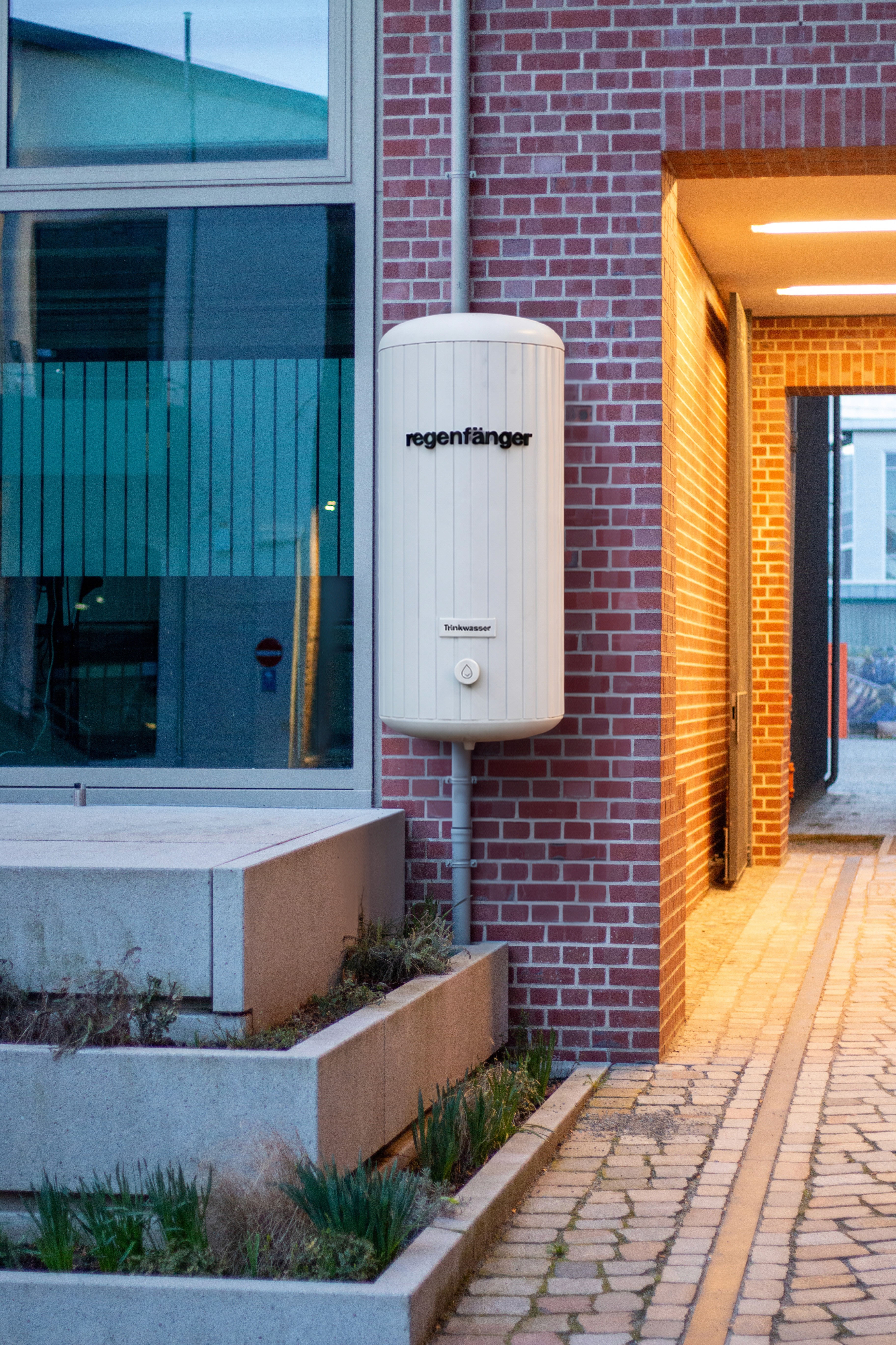 Die vertikale Form ermöglicht eine modulare und flexible Installation an Hauswänden. Gleichzeitig macht sie das Objekt im Stadtraum als Wasserstelle klar erkennbar. Das abgefangene Regenwasser durchläuft anschließend einen vierstufigen, herausnehmbaren Gravitationsfilter aus natürlichen Materialien wie Quarzfilterkies, Quarzsand, Zeolith und Aktivkohle, der über die Oberseite entnommen und gewartet werden kann. Durch das unten liegende Federventil lässt sich das Wasser auf einer barrierearmen Höhe zapfen . So wird der Regenfänger zu einer Schnittstelle zwischen Architektur, Ressource und Nutzung und dient als eine Art Tankstelle im urbanen Raum.